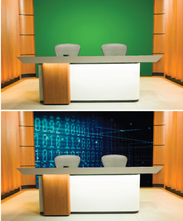 The studio has two spaces with different interaction capabilities: a desk with a computer and a screen, onto which any content can be displayed on the background or in full screen for the viewers. The second space has a pulpit and a large touch screen monitor, an interactive whiteboard which allows the user to interface directly with the presented content. Both spaces can be covered by chroma-key backgrounds, which allow for different digital backdrops, projecting images as needed.