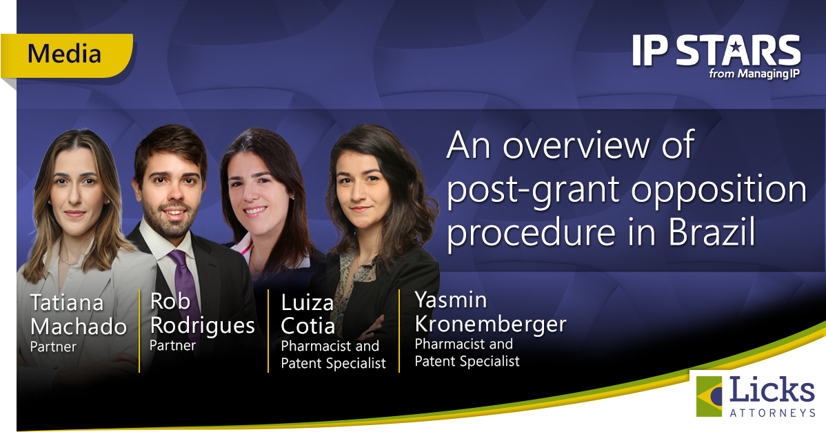 Licks Attorneys partners Tatiana Machado and Rob Rodrigues, Co-Head of Patents Luiza Cotia, and Patent Specialist Yasmin Kronemberger published the article "An overview of post-grant opposition procedure in Brazil" at the “IP STARS” website. Read the full article at: https://lnkd.in/dsctNKG9