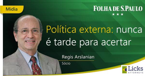 Regis Arslanian, partner, published the article “Foreign policy: It's never too late to get it right”, in the “Folha de São Paulo”. The text focuses on the fact that Brazil should, as soon as possible, abandon ideological rhetoric and adopt a more pragmatic diplomacy that is geared to national interests and rebuild alliances with other countries, strengthening multilateralism. Read the full article: https://www1.folha.uol.com.br/opiniao/2021/02/politica-externa-nunca-e-tarde-para-acertar.shtml?origin=folha