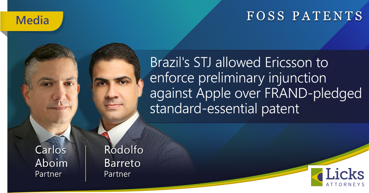 Our partners Carlos Aboim and Rodolfo Barreto were mentioned in the post “Burgeoning IP and antitrust jurisdiction: Brazil's Superior Court of Justice allowed Ericsson to enforce preliminary injunction against Apple over FRAND-pledged standard-essential patent”, published in the Foss Patents blog. The publication highlights the decision of the Brazilian Superior Court of Justice in the Ericsson v. Apple case, which enabled a global agreement between the two companies. “In a major win for Ericsson's counsel, Licks Attorneys' Rodolfo Barreto and founding partner (who once worked as a full-time intern for the Federal Circuit's famous former Chief Judge Rader) Carlos Aboim, the enforcement of a temporarily-stayed SEP-based PI against Apple was allowed.” Read more at: http://www.fosspatents.com/2023/01/burgeoning-ip-and-antitrust.html