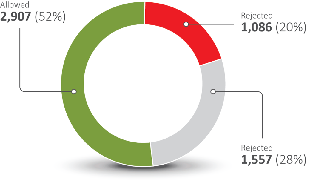 As shown in the diagram below, from the 5550 applications for which an office action grounded on double patenting was issued between 2018 and 2022, 2907 were allowed and 1086 were denied: