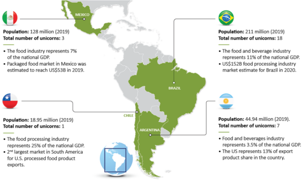 Latin America and the Caribbean will account for 25% of global agricultural and fisheries exports by 2028, according to a report by the Food and Agriculture Organization of the United Nations (FAO) and Organization for Economic Cooperation and Development (OECD).[1] An Endeavor-Pepsico 2021 Report[2] shows that Brazil, Chile, Mexico, and Argentina stand out in the food market and industry, including food-innovative initiatives from unicorn startups companies.