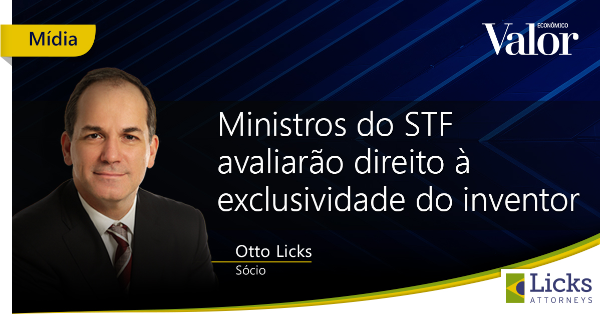 Valor Econômico published the article “Ministers of the Supreme Court will assess the inventor’s right to exclusivity” on patent granting by the Brazilian Patent and Trademark Office (BRPTO), a process whereby the inventor is guaranteed the exclusive rights to their creation. At issue is the length of this exclusivity, and it is currently the subject of a hearing by the Federal Supreme Court (STF). Licks Attorneys were cited in the article as a source of content. To find out more, please visit https://glo.bo/3s12zCS