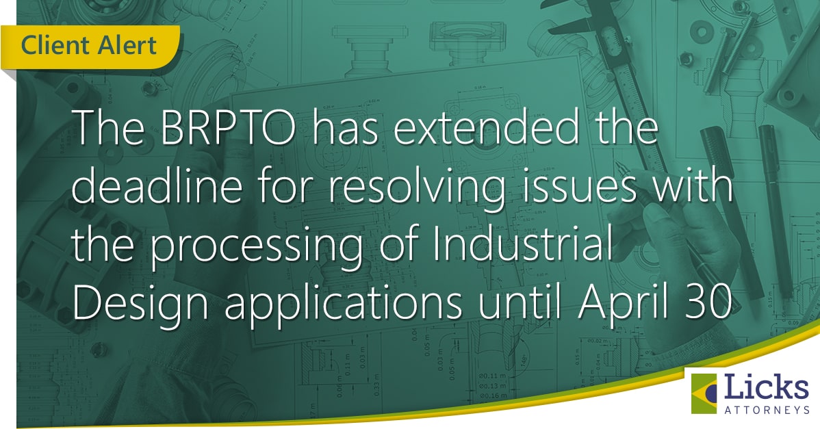 The BRPTO has extended the deadline for resolving issues with the processing of Industrial Design applications until April 30