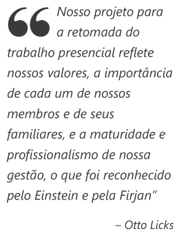 "Nosso projeto para a retomada do trabalho presencial reflete nossos valores, a importância de cada um de nossos membros e de seus familiares, e a maturidade e profissionalismo de nossa gestão, o que foi reconhecido pelo Einstein e pela Firjan”, diz Otto Licks. “A confiança que os membros do escritório têm hoje em nossa capacidade de ter um ambiente seguro é o grande diferencial. Um impacto positivo muito evidente, onde os membros, suas famílias e os clientes ganharam. Agora estamos estendendo o programa para os escritórios em São Paulo, Brasília, Curitiba e Tóquio"